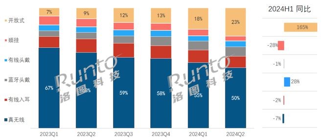 The explosion of open source (OWS) headphones is the main driving force for the growth of the headphone market. Due to its comfortable and safe wearing design that does not enter or harm the ears, open earphones have become one of the key product lines for major manufacturers to focus on this year and in the future. According to online monitoring data from RUNTO Technology, in the first half of 2024, the market share of open earphones in the online earphone market reached 20.9%, an increase of 12.7 percentage points compared to the same period last year, and sales increased significantly by 165% year-on-year, which is an absolute increase in the overall earphone market. Among them, the sales proportion in the second quarter of 2024 has further expanded, approaching a quarter of the market.