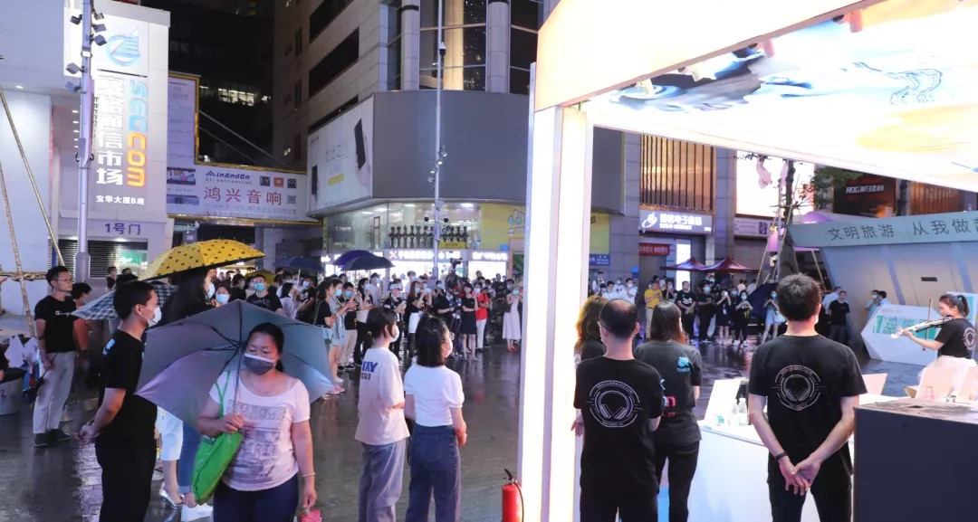 晚上7時30分,精彩的小提琴表演正式開始,隨著靈動的琴聲響起,絢爛的燈光下,為雨夜增添了些許浪漫,瞬間吸引了眾多游客駐足觀看,一曲琴音落,博得現(xiàn)場眾多掌聲與喝彩。